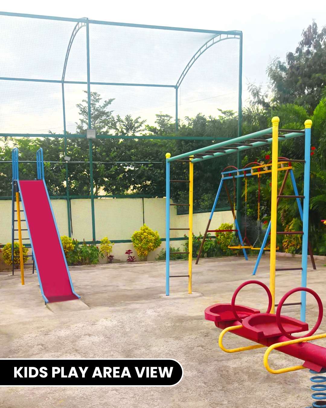 A large lawn measuring 50 ft width × 70 ft length is available for outdoor activities and relaxation. Children can enjoy a dedicated play area featuring swings, slides, and seesaws for fun and entertainment.