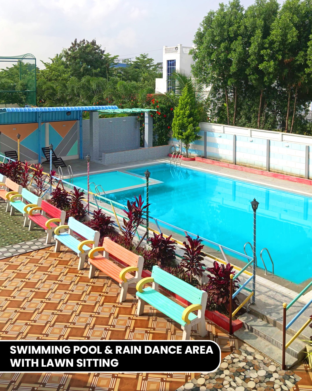 Enjoy a refreshing experience in the swimming pool measuring 25 ft width × 50 ft length with depths ranging from 1 ft to 4.5 ft, suitable for both adults and kids.